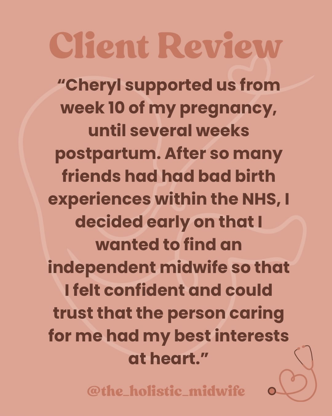 “I stumbled on Cheryl's Instagram page after a bad first experience with maternity services with my first baby. I thought that what she published really resonated with everything that I wish I had for my first birth. I then thought she'd definitely be a good midwife if I got pregnant again.